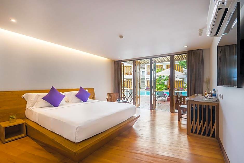 This room offers easy access to the pool, just a few steps away.